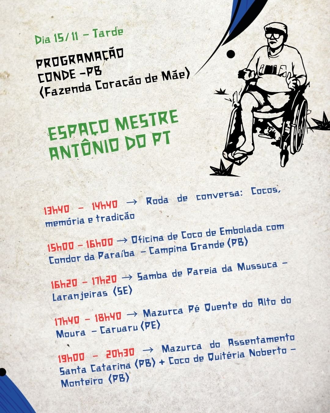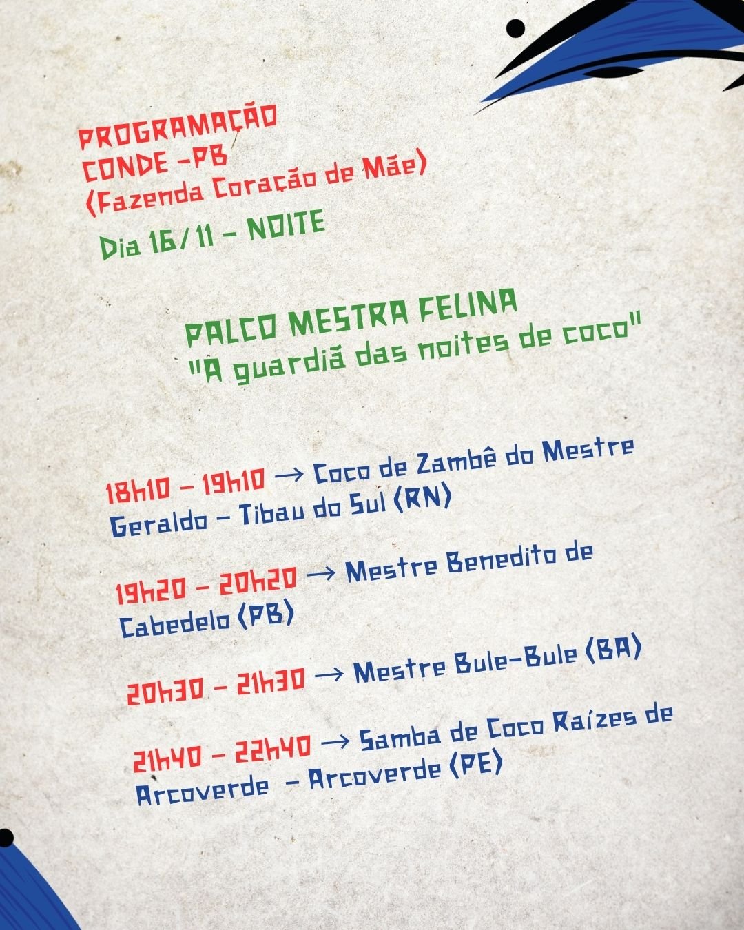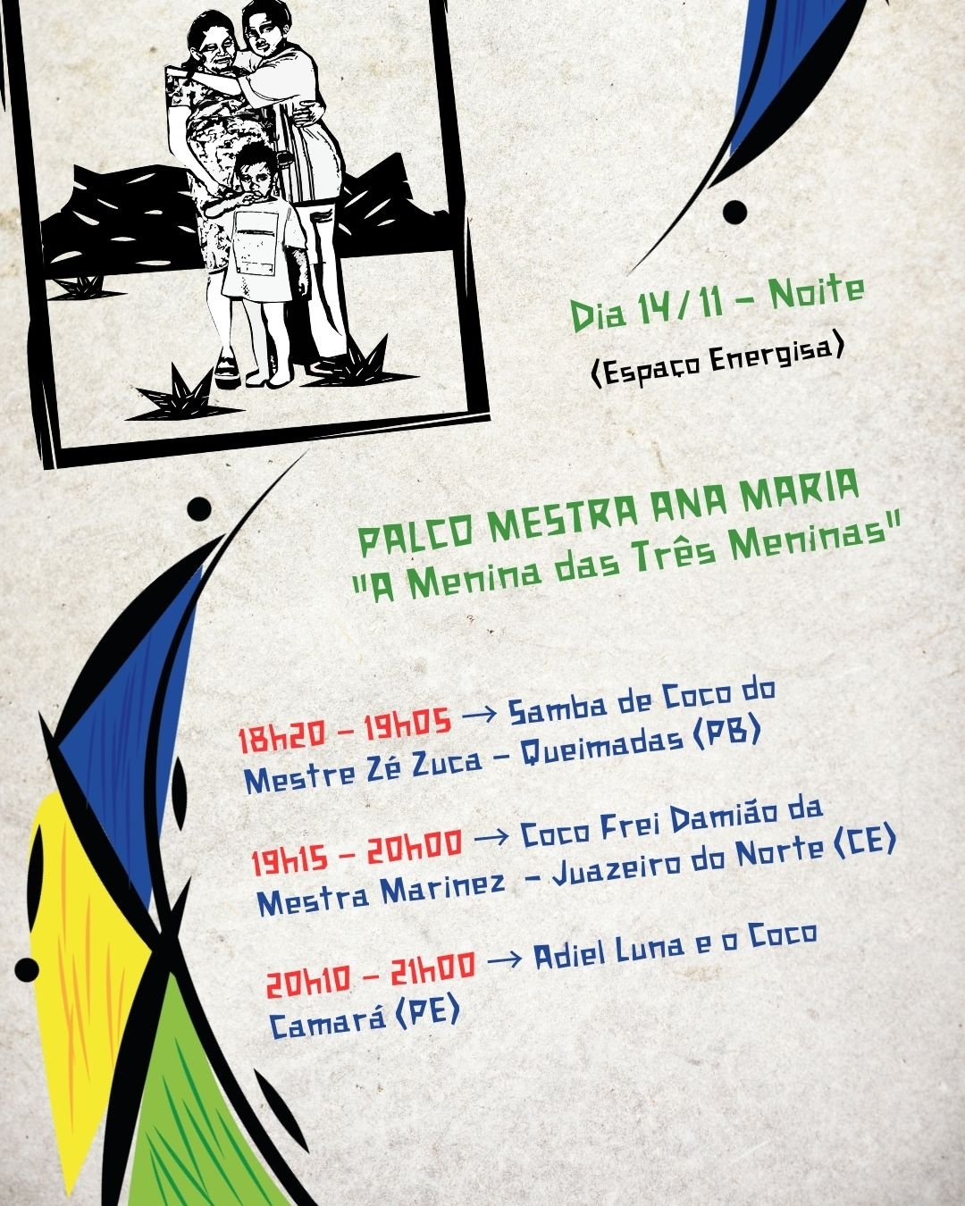 Mais de 20 grupos, mestres e mestras — como Mestre Inácio, a Ciranda dos Tupinambás, as Ceguinhas de Campina Grande, o Coco do Congo, o Coco de Iguape, o Coco de Zambê e o Coco do Pirinã — vão se reunir para encantar com apresentações, danças e oficinas que celebram o melhor das nossas tradições.