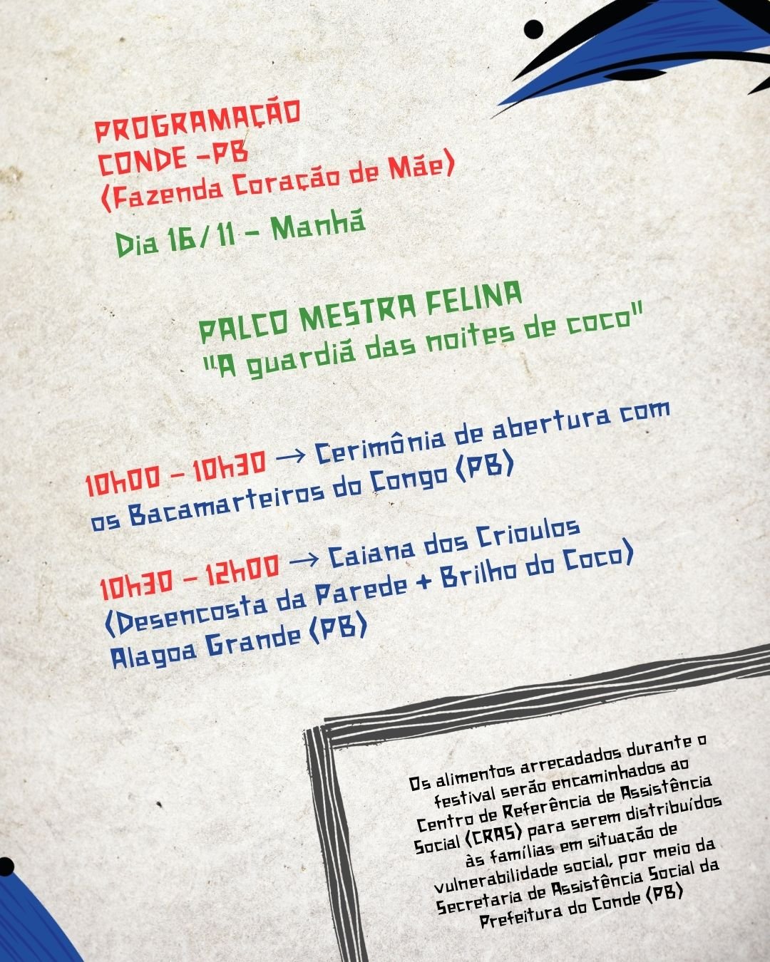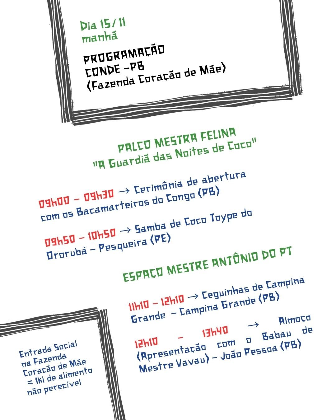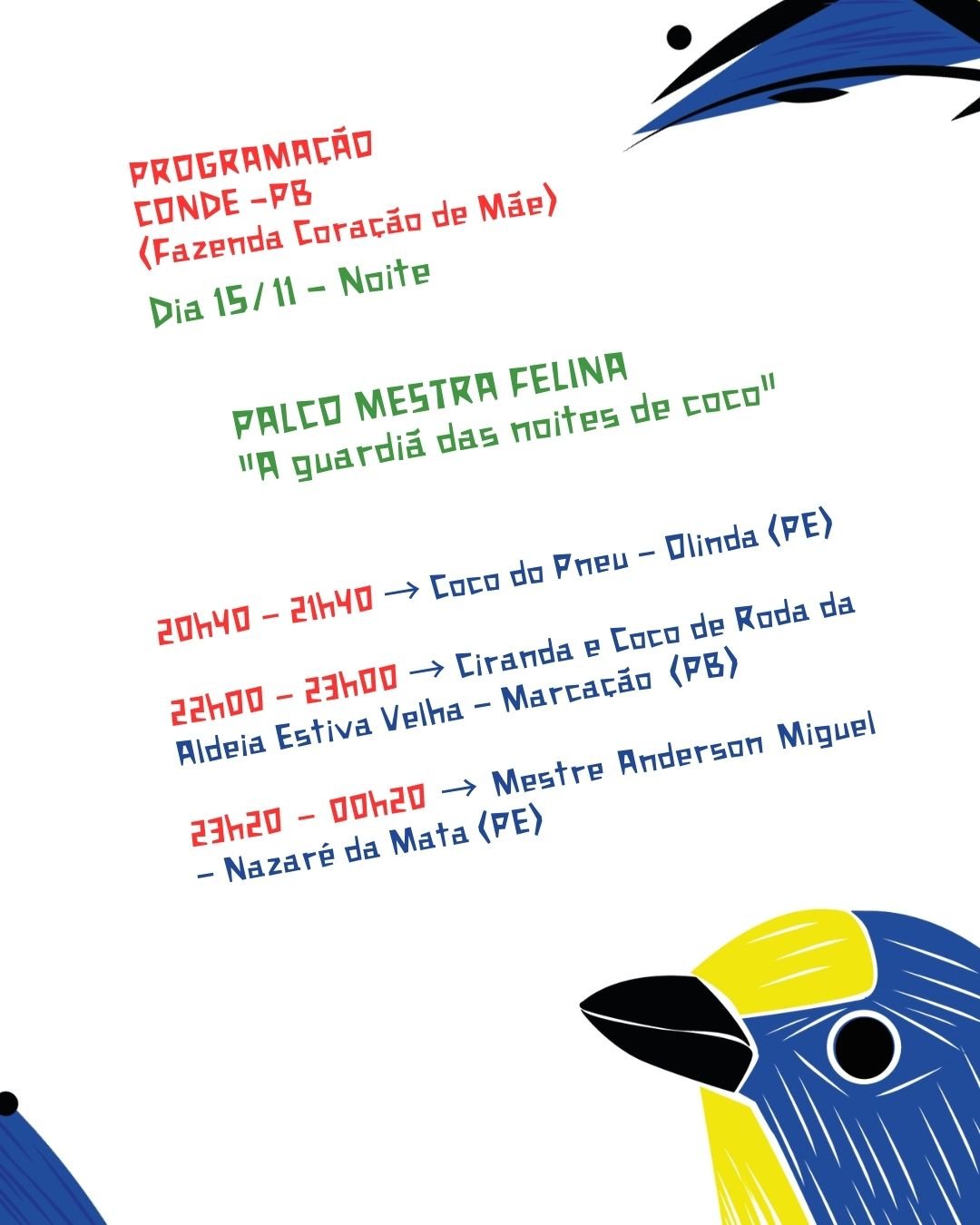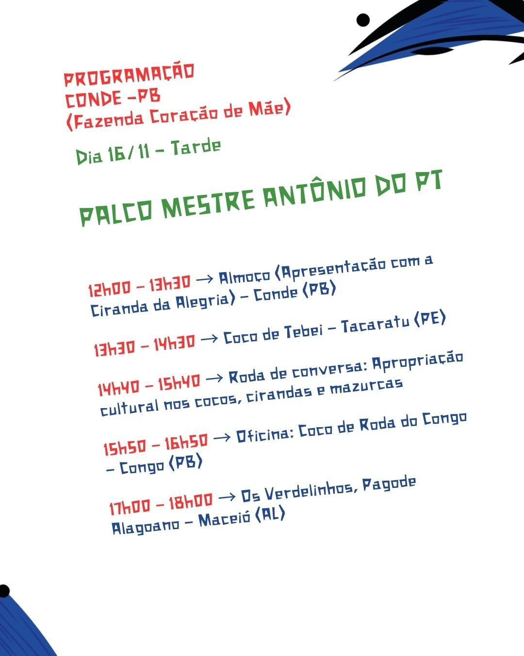 Mais de 20 grupos, mestres e mestras — como Mestre Inácio, a Ciranda dos Tupinambás, as Ceguinhas de Campina Grande, o Coco do Congo, o Coco de Iguape, o Coco de Zambê e o Coco do Pirinã — vão se reunir para encantar com apresentações, danças e oficinas que celebram o melhor das nossas tradições.